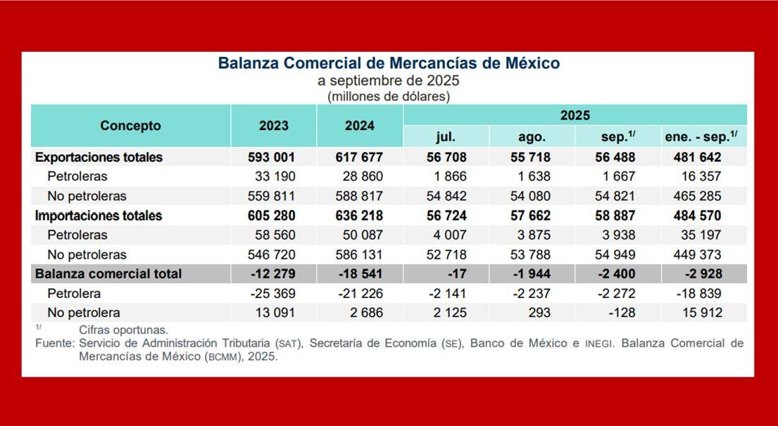 Registra déficit la balanza comercial de México en septiembre