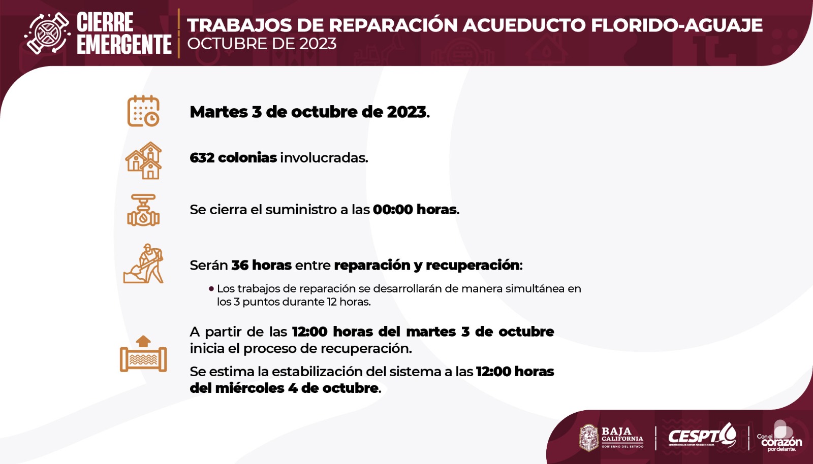 Anuncian suspensión de servicio de agua en varias colonias de Ensenada por dos días